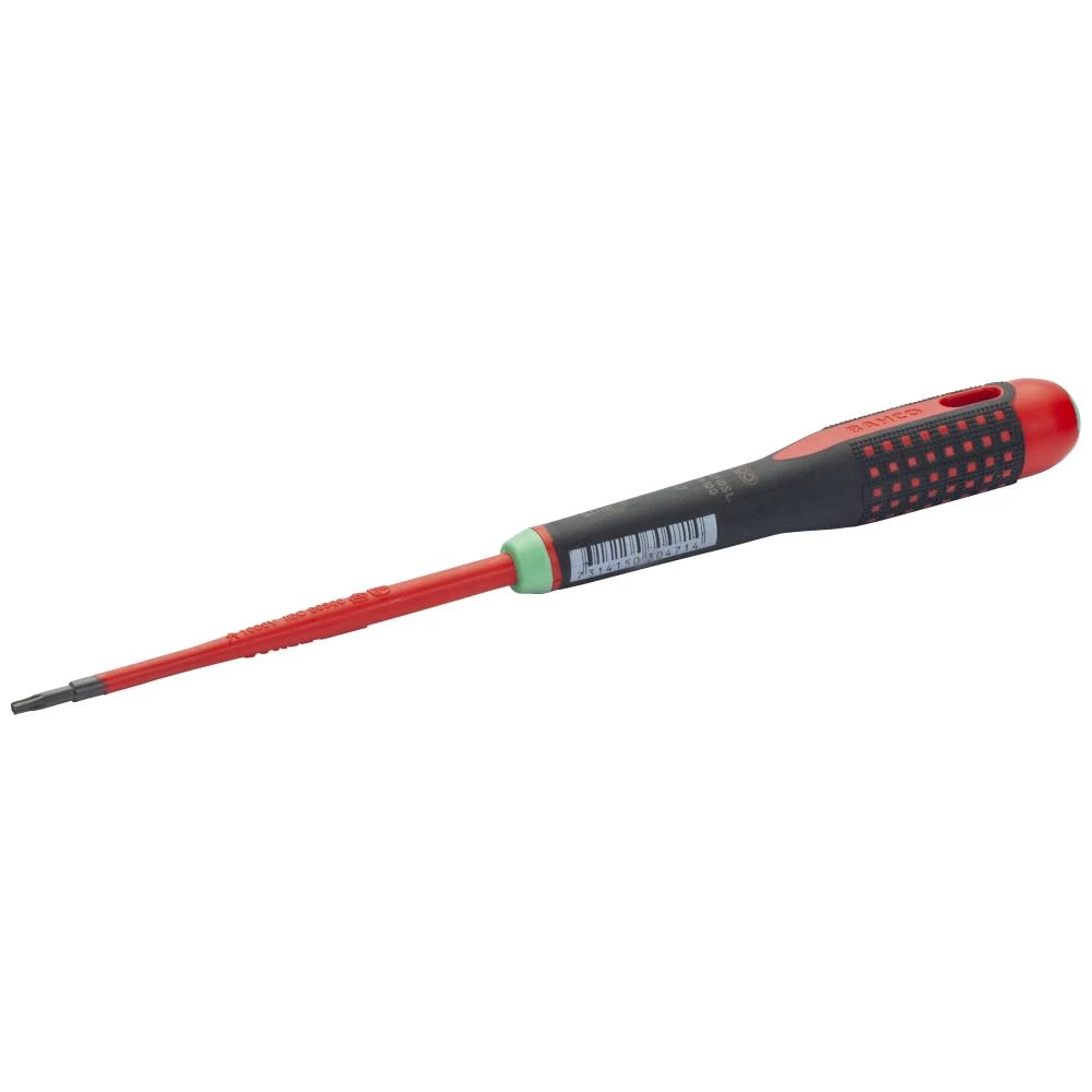 Ergo isoleret VDE-skruetrækker med reduceret klingediameter til Torxskruer. Klingen er 30 % smallere end ordinære isolerede klinger. Klingeisolering støbt direkte på klingen. Spids med fosfateret finish giver præcis pasform og ingen afskalning. 3-komponent håndtag i blødt materiale med nubret overflade giver overlegen greb og større kraftoverførsel. Farvekodet håndtag og permanent symbol på enden af håndtaget. Integreret ophængshul. Til arbejde under spænding op til 1.000 V. Individuelt kontrolleret og fremstillet i henhold til IEC 60900, testet i et vandbad ved 10.000 V. Standarder: ISO 2380 og DIN 5264. Fås i flere størrelser.