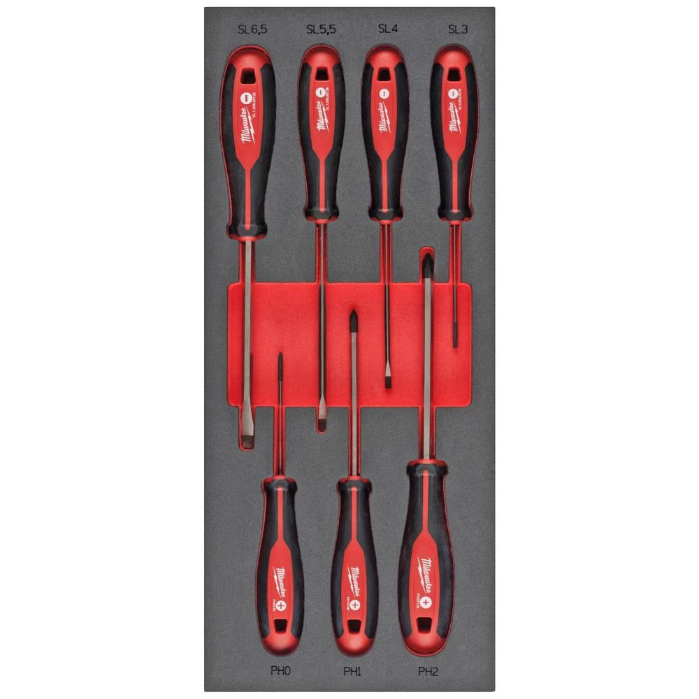 Skruetrækkersæt med 7 dele i skumindlæg til sortimentet af Milwaukee værktøjsvogne. Skruetrækkere med Tri-Lobe håndtag for maksimal brugerkomfort og moment-tunge opgaver. Permanent ID-markering af størrelser. Hul til sikkerhedsline. Hærdet magnetisk spids der giver ekstrem holdbarhed og øget brugervenlighed. Ruller ikke, 3-sidet krave på greb. Skaft tager imod skiftenøgle for ekstra moment. Indeholder: SL 0,5×3×75 mm, SL 0,8×4×100 mm, SL 1,0×5,5×125 mm, SL 1,2×6,5×125 mm, PH0×75 mm, PH1×100 mm, PH2×125 mm.