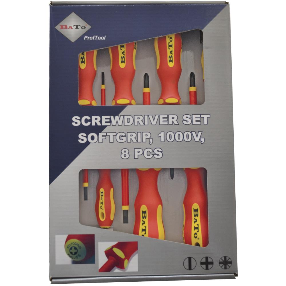 Skruetrækkersæt med 8 dele. Skruetrækkere med softgreb til brug på emner op til 1.000 V. Indeholder lige kærv 2,5 / 3,0 / 4,0 og 5,5 mm, PH2 samt PZ0, PZ1 og PZ2.