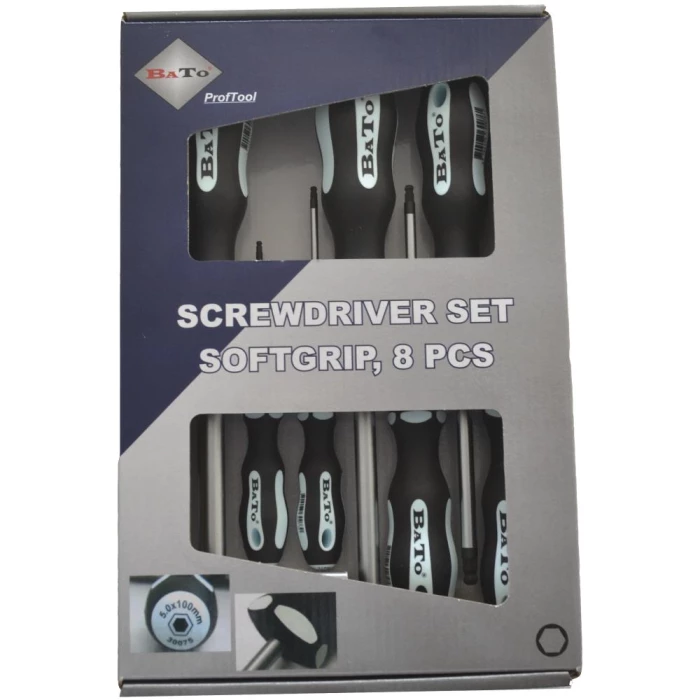 Skruetrækkersæt med 8 dele. Skruetrækkere med kugle, udv. 6kt (hex) og softgreb. Indeholder 2,0 / 2,5 / 3,0 / 4,0 / 5,0 / 6,0 / 8,0 og 10,0 mm.