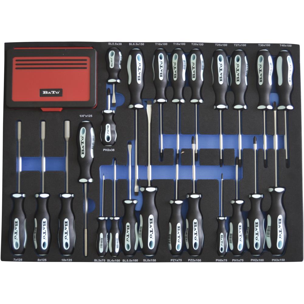 Mega skruetrækkersæt med 25 dele i EVA-skumindlæg klar til værktøjsvognsskuffe. Sættet indeholder: Lige kærv skruetrækkere 3,0×75 mm / 4,0×100 mm / tumling 5,5×38 mm / 5,5×100 mm / 6,5×150 mm / 8,0×150 mm. Phillips skruetrækkere Ph0×75 mm / Ph1×75 mm / tumling Ph2×38 mm / Ph2×100 mm / Ph3×150 mm. Pozidriv skruetrækkere Pz1×75 mm / Pz2×100 mm. Torx skruetrækkere TX10×100 mm / TX15×100 mm / TX20×100 mm / TX25×100 mm / TX27×100 mm / TX30×100 mm / TX40×100 mm. Topskruetrækkere 7,0×125 mm / 8,0×125 mm / 10,0×125 mm. Bitsskruetrækker 1/4″×125 mm. 1/4″ bitssæt i æske med 100 bits. Skumindlægget fylder 1/1 skuffe i Bato værktøjsvogn.