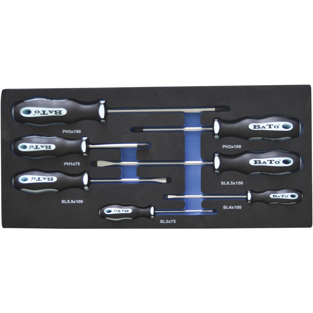 Skruetrækkersæt med 7 dele i EVA-skumindlæg klar til værktøjsvognsskuffe. Skruetrækkere med softgreb til lige kærv- og Phillips skrueforbindelser. Sættet indeholder: Lige kærv skruetrækkere 3,0×75 mm / 4,0×100 mm / 5,5×100 mm / 6,5×150 mm. Phillips skruetrækkere Ph1×75 mm / Ph2×100 mm / Ph3×150 mm. Skumindlægget fylder 1/3 skuffe i Bato værktøjsvogn.