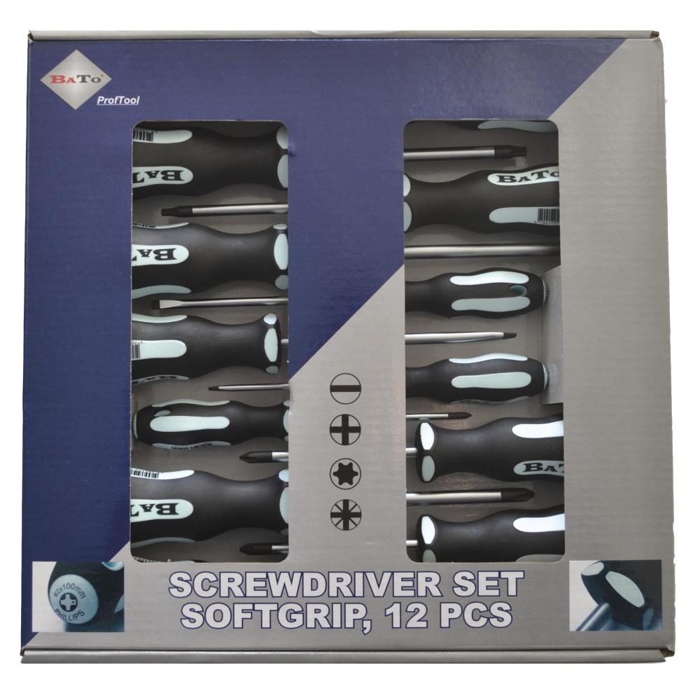 Skruetrækkersæt med 12 dele. Skruetrækkere med softgreb. Indeholder lige kærv 3,0 / 4,0 / 5,5 og 6,5 mm, PH0, PH1 og PH2, PZ1 og PZ2 samt TX15, TX20 og TX25.