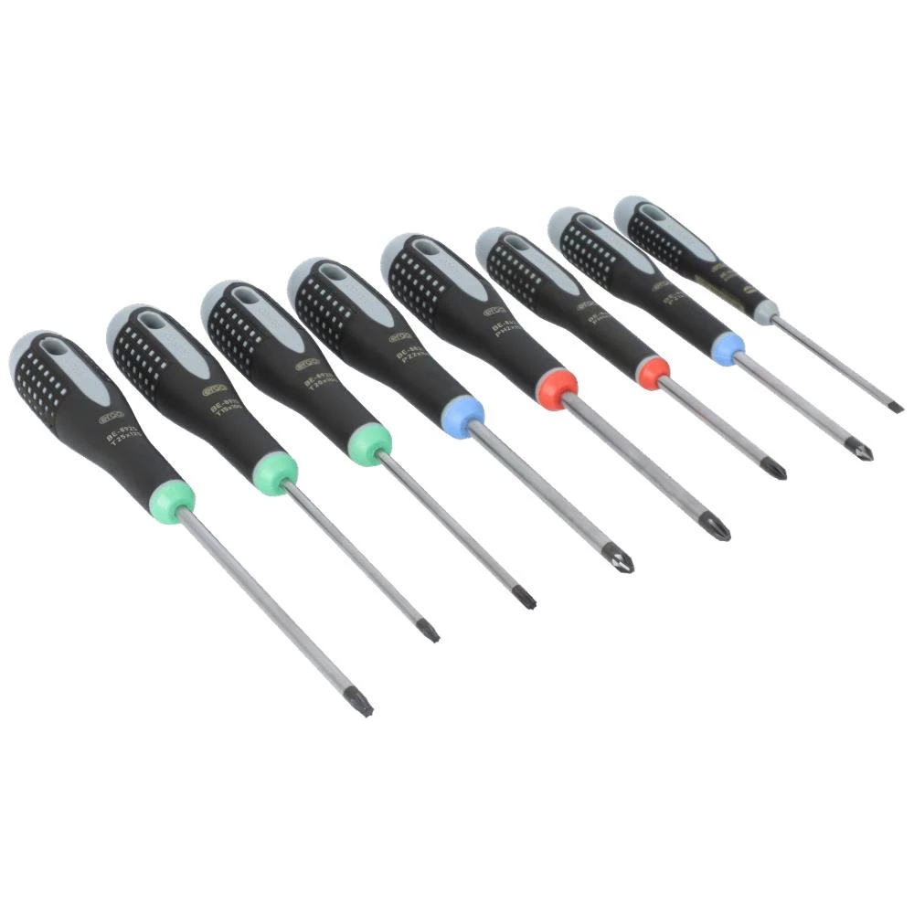 Ergo skruetrækkersæt med 8 skruetrækkere (ligekærv/Phillips/Pozidriv/Torx). Skruetrækker udviklet i henhold til Bahcos Ergo program. 3-komponent håndtag til maksimal brugervenlighed, blødt materiale med nubret overflade giver overlegen greb og større kraftoverførsel. Integreret ophængshul. Højtlegeret stålklinge, forkromet og helhærdet for høj beskyttelse mod rustdannelse. Fosfateret spids for større nøjagtighed. Nemt at vælge den rigtige tip med det farvekodede håndtag og permanent symbol på den kuplede ende (ingen farveidentifikation på de ekstra små håndtag, kode BE-8030, ligekærv 3,5 mm). Sættet indeholder: ligekærv: 0,6×3,5×75 mm, Phillips: PH1×75, PH2×100 mm, Pozidriv: PZ1×75, PZ2×100 mm, Torx: TX15×100, TX20×100, TX25×125.