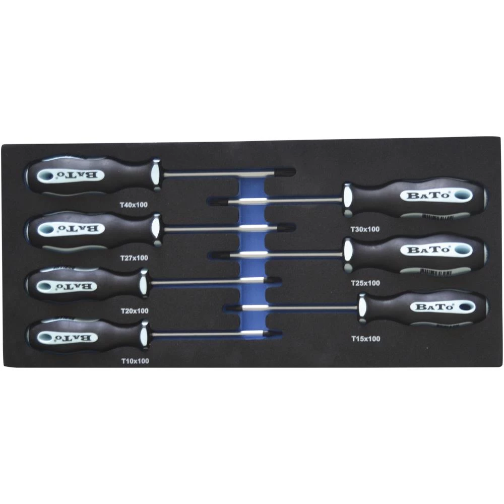 Skruetrækkersæt med 7 dele i EVA-skumindlæg klar til værktøjsvognsskuffe. Skruetrækkere med softgreb til Torx skrueforbindelser. Sættet indeholder størrelserne: TX10×100 mm / TX15×100 mm / TX20×100 mm / TX25×100 mm / TX27×100 mm / TX30×100 mm / TX40×100 mm. Skumindlægget fylder 1/3 skuffe i Bato værktøjsvogn.