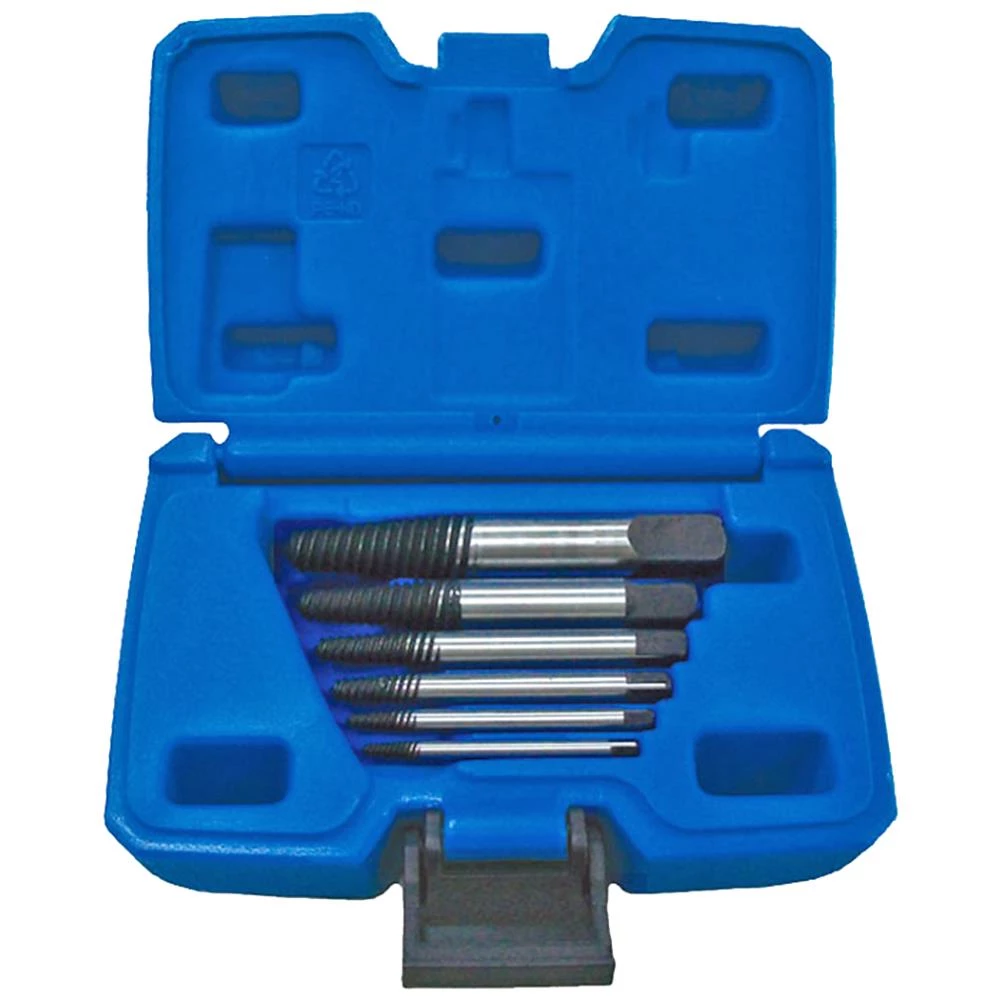 Skrueudtrækkersæt med 6 dele. Indeholder: M3-M4 (1/8″-3/4″), M5-M7 (3/16″-1/4″), M8 (5/16″), M10-M12 (3/8″-7/16″), M14-M16 (1/2″-9/16″) og M18-M22 (5/8″-3/4″). Leveres i plastkuffert.