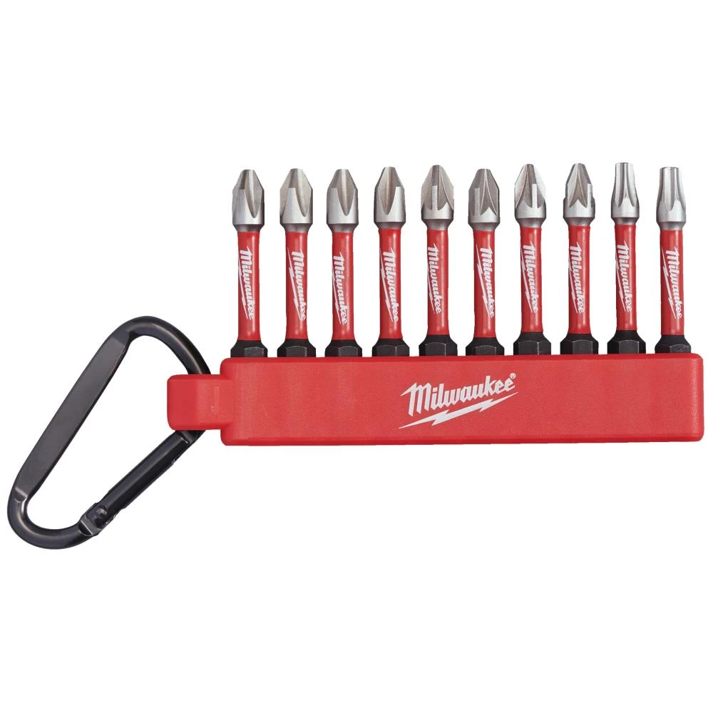 Shockwave Impact Duty slagbitsæt med 10 dele. Indhold: 4× PH2, 4× PZ2, 1× TX20, 1× TX25. Leveres i praktisk holder med karabinhage.
