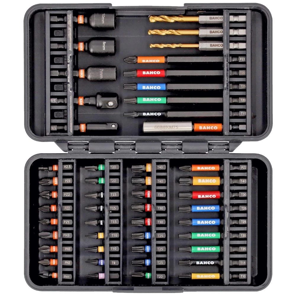 1/4″ slagbitssæt med slank 75 mm bitholder, 2 slagtopadaptorer, 3 slagboltbits, 3 HSS-TiN-bor (3/4/5 mm) og 41 slagbits til Phillips-, Pozidriv- sekskant- og Torxskruer. Udviklet til brug med slagskruemaskiner og velegnet til hårde materialer. Torsionszone absorberer momentspidser og gør bitsene mere slidstærke mod pludselige slag (i hårde materialer eller ved brug af en slagboremaskine), hvilket forhindrer spidsen i at knække for tidligt og forbedrer levetiden. Bits fremstillet af højtlegeret stål med manganfosfat-finish. 1/4″ sekskant drev DIN 3126 og ISO 1173, type C 6.3. Torx-bits har farvet markering, så det er nemt at identificere spidsens størrelse. Leveres i robust delbar og stabelbar plastboks med 180° låsefunktion og svingbare bitsrækker.