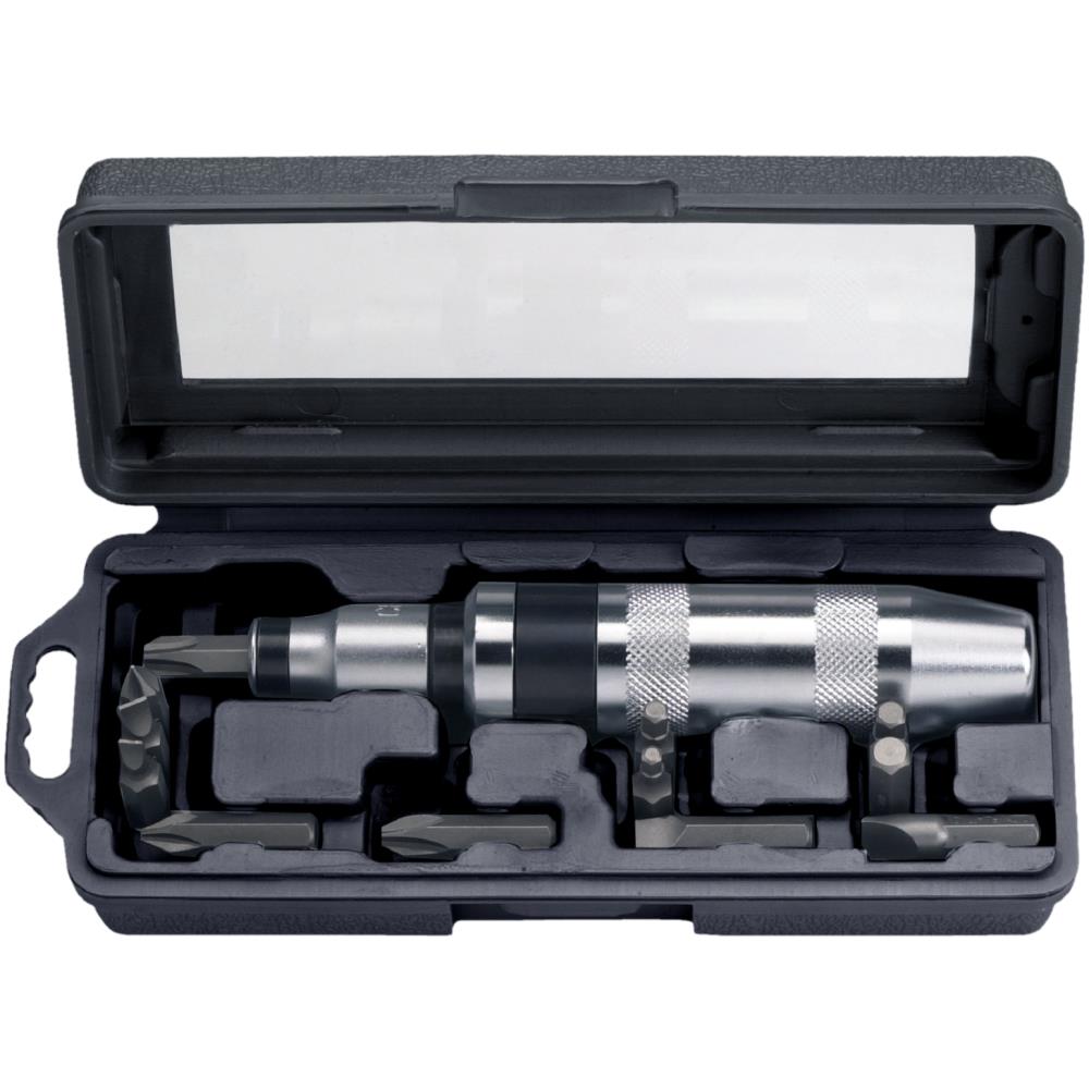 Slagskruetrækkersæt med 15 dele i sort plastkasse. Indeholder: 1 stk. slagskruetrækker, 1/2″ 4kt-indfæstning. 1 stk. bitholder for skruetrækkerbits, 5/16″ 6kt og 1/2″ 4kt-indfæstning. 4 stk. kærvbits, 5/16″ 6kt-tindfæstning (5, 6, 8, 10 mm). 4 stk. Phillips-bits, 5/16″ 6kt-indfæstning (PH 1, 2, 3, 4). 4 stk. 6kt-bits (Unbrako), 5/16″ 6kt-indfæstning (4, 5, 6, 8 mm). 1 stk. overgang, 6kt 5/16″ til 1/2″ 4kt-tindfæstning.