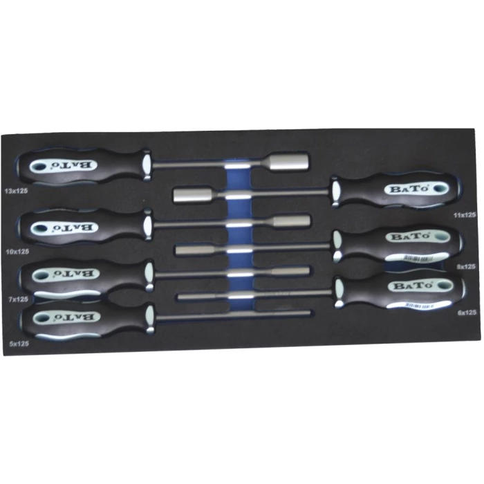 Topskruetrækkersæt med 7 dele i EVA-skumindlæg klar til værktøjsvognsskuffe. Topskruetrækkere med softgreb. Sættet indeholder størrelserne: 5,0×125 mm / 6,0×125 mm / 7,0×125 mm / 8,0×125 mm / 10,0×125 mm / 11,0×125 mm / 13,0×125 mm. Skumindlægget fylder 1/3 skuffe i Bato værktøjsvogn.