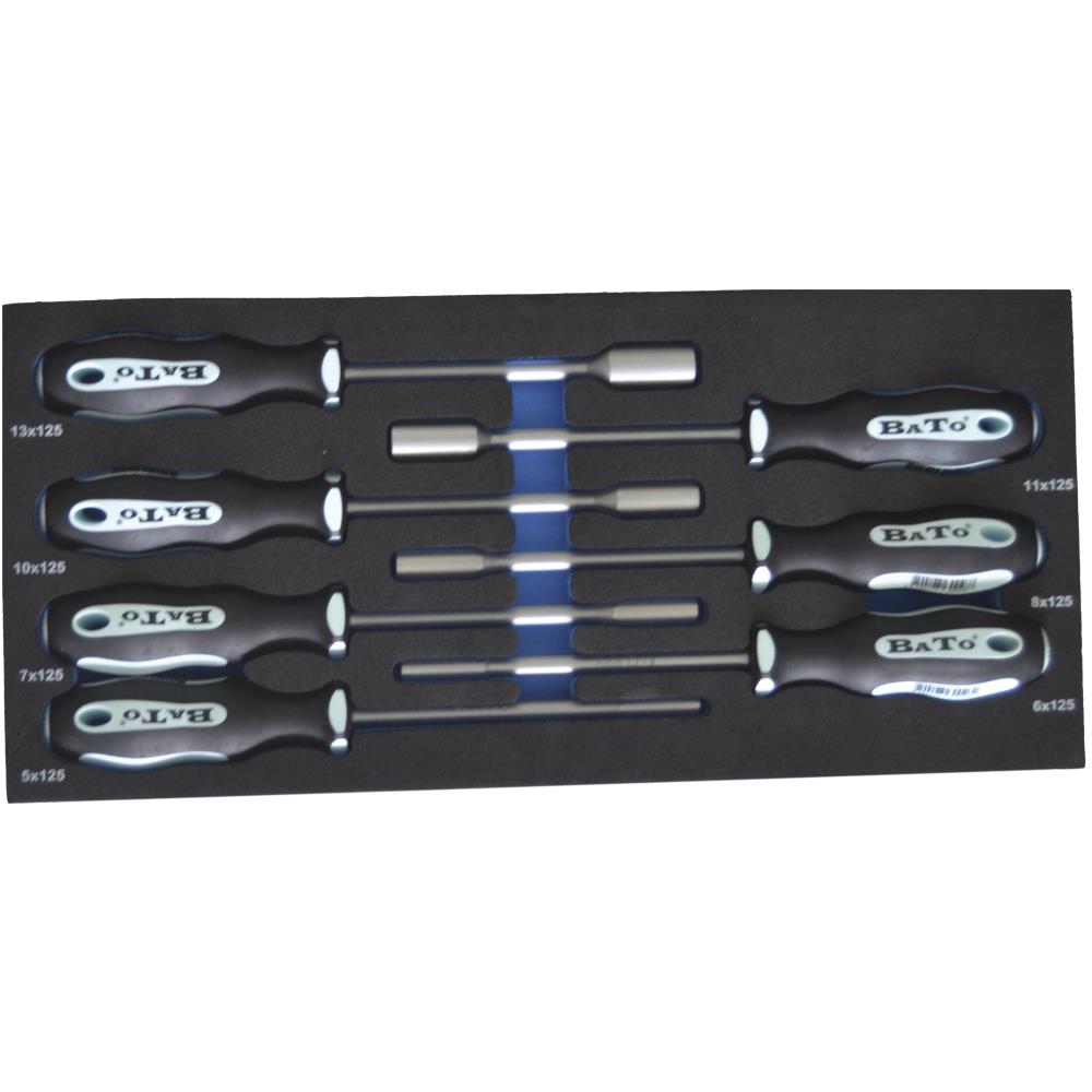 Topskruetrækkersæt med 7 dele i EVA-skumindlæg klar til værktøjsvognsskuffe. Topskruetrækkere med softgreb. Sættet indeholder størrelserne: 5,0×125 mm / 6,0×125 mm / 7,0×125 mm / 8,0×125 mm / 10,0×125 mm / 11,0×125 mm / 13,0×125 mm. Skumindlægget fylder 1/3 skuffe i Bato værktøjsvogn.