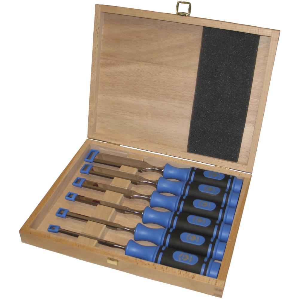 Stemmejernsæt med 6 dele i trææske. Korte stemmejern med let mønster og affasede kanter. Blåt, tokomponent-hæfte. Indeholder str. 6, 10, 12, 16, 20 og 26 mm.