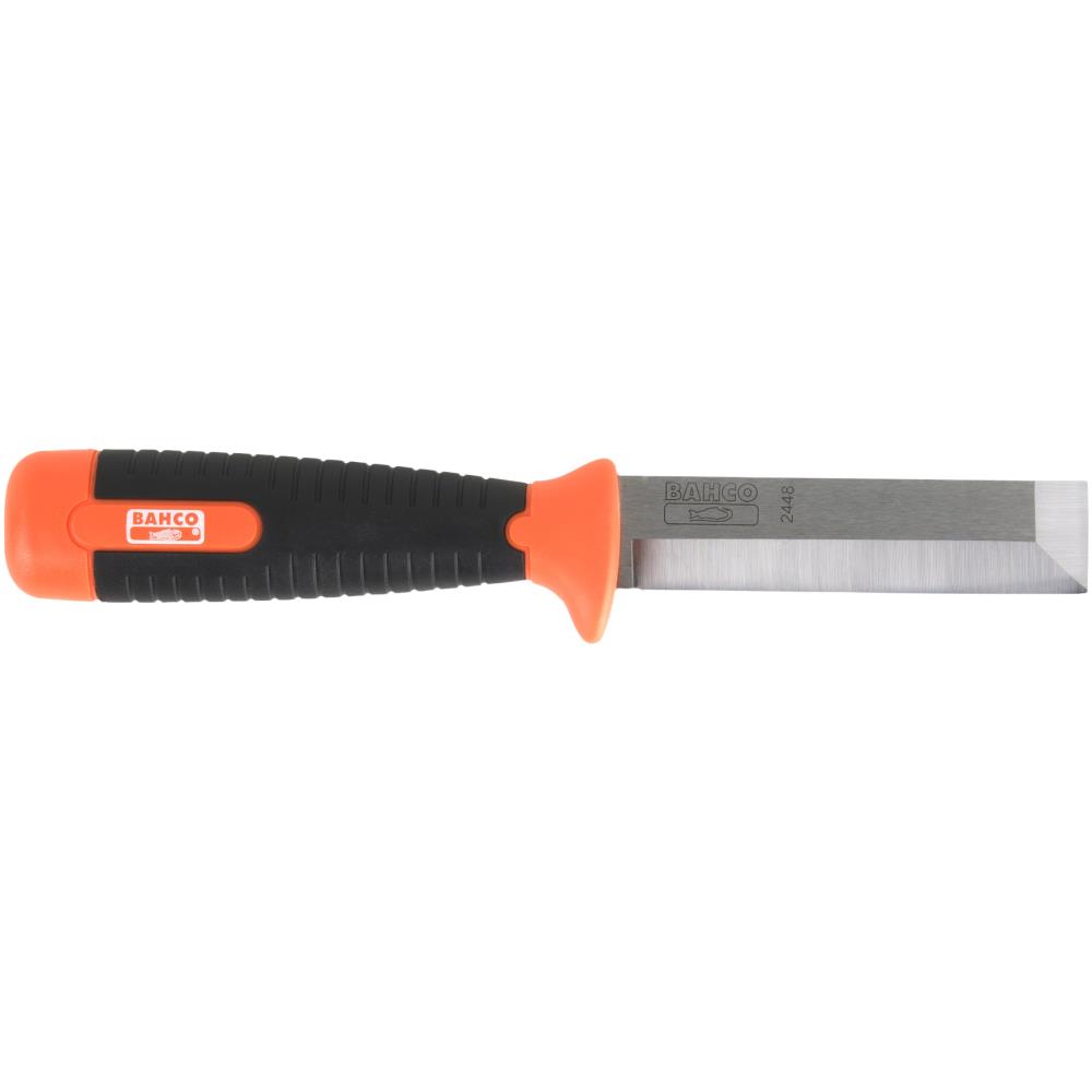 Stemmejernskniv til krævende snedker, bygge- og anlægsarbejde. Håndtaget er fremstillet i slagfast tokomponent materiale med beskyttelseskant og afrundede “skuldre” for optimal sikkerhed. Klingen er præcisionsslebet for maksimal skarphed, og tåler slag med hammer – hærdet til 58-61 HRC. Klingen er 4 mm tyk og måler 25×100 mm – knivens samlede længde er 231 mm. Leveres med praktisk beskyttelsesskede.