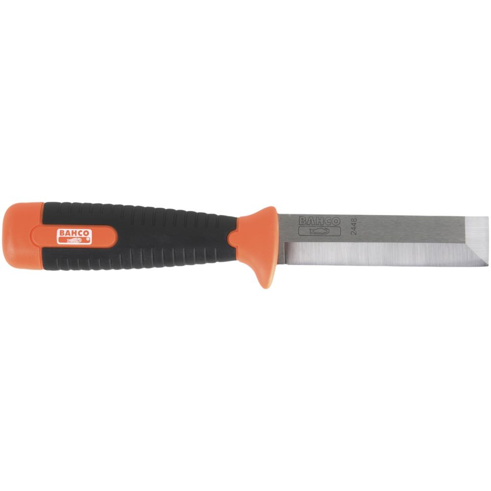 Stemmejernskniv til krævende snedker, bygge- og anlægsarbejde. Håndtaget er fremstillet i slagfast tokomponent materiale med beskyttelseskant og afrundede “skuldre” for optimal sikkerhed. Klingen er præcisionsslebet for maksimal skarphed, og tåler slag med hammer – hærdet til 58-61 HRC. Klingen er 4 mm tyk og måler 25×100 mm – knivens samlede længde er 231 mm. Leveres med praktisk beskyttelsesskede.