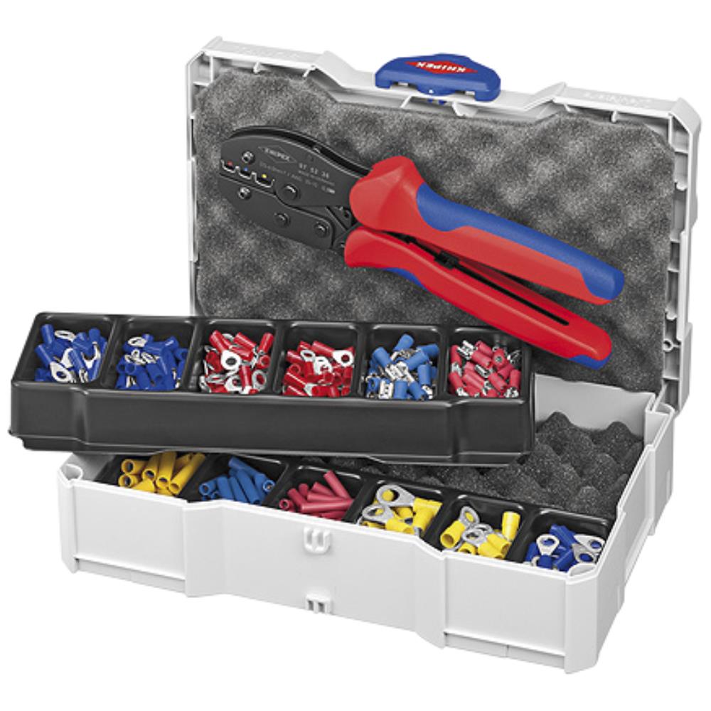 Crimp-sortiment til kabelforbindere. I TANOS MINI-systainer (stabil kunststofbox). T-Loc-lås til enhåndsbetjening, så med en drejning åbnes eller lukkes systainer og forbindes med en anden systainer. Åbning i forbundet tilstand, for nemt og hurtigt at gribe indholdene uden at løsne forbindelsen. To kunststofindsatser, kan stables, hver med 6 fordybninger til forbindere. Med et sortiment almindelige kabelforbindere. Med crimptang PreciForce 97 53 36 (til isolerede kabelsko og forbindere).