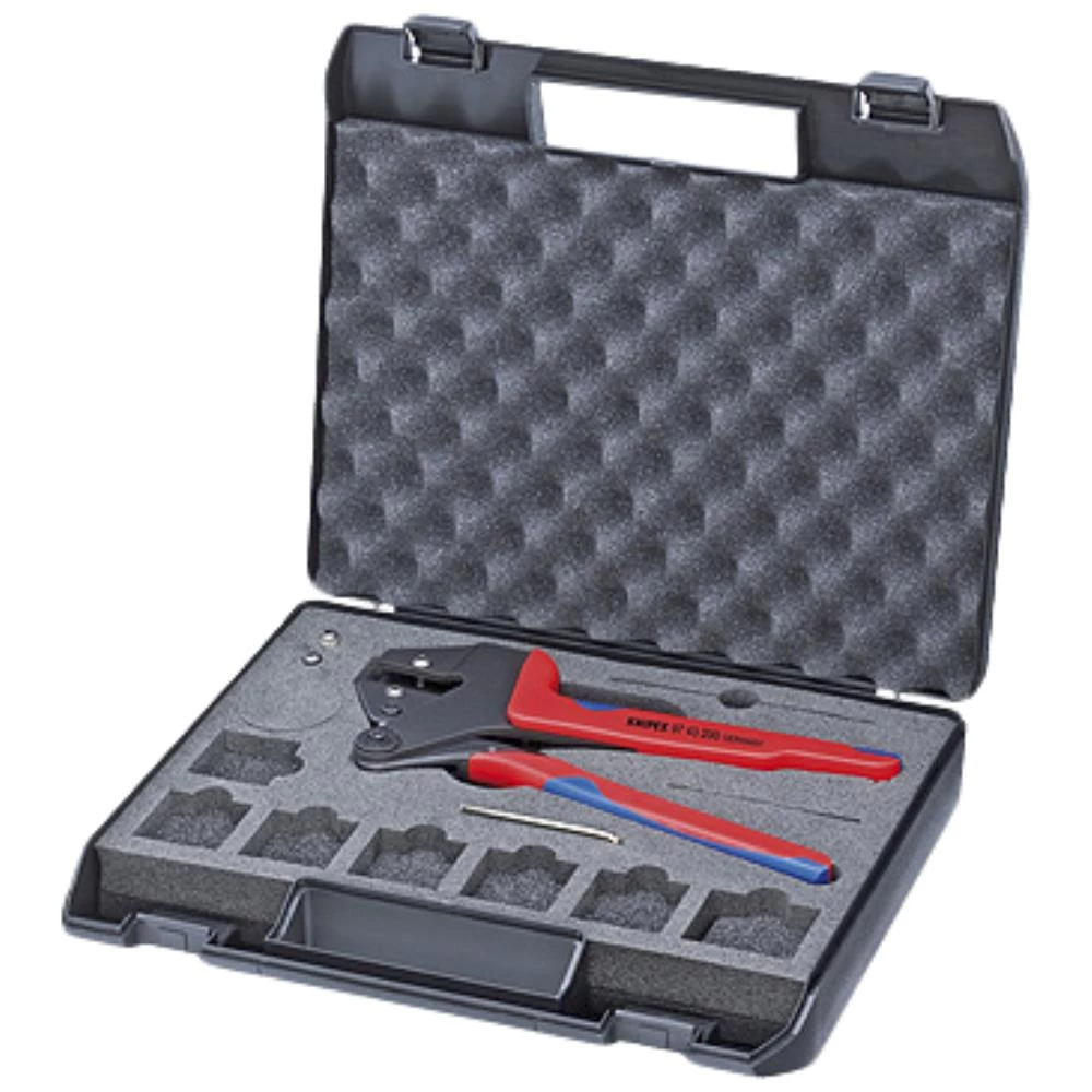 Crimp-systemtang bruneret 200 mm. Kun ét værktøj til næsten 1000 crimpanvendelser. Nærmest parallel crimpbevægelse. Vedblivende høj crimpkvalitet pga. præcisionsprofiler og tvangsspærre med trin (kan låses op). Crimptrykket er præcist indstillet (kalibreret) fra fabrikkens side, kan justeres. Kraftforstærkning pga. vægtstangsudveksling for arbejde uden anstrengelse. Ergonomisk formede greb. Forskellige positioneringshjælpemidler til præcis positionsbestemmelse. Crimpindsatser til anvendelser, som går videre end det tilbudte sortiment, på forespørgsel. Krom-Vanadium-elektrostål i specialkvalitet, oliehærdet. Uden crimpindsats. I plastkuffert- skumplastindlæg med udskæringer til opbevaring af crimpindsatser og positioneringshjælpemidler, med montageværktøj (unbrakonøgle), skruer og møtrikker.