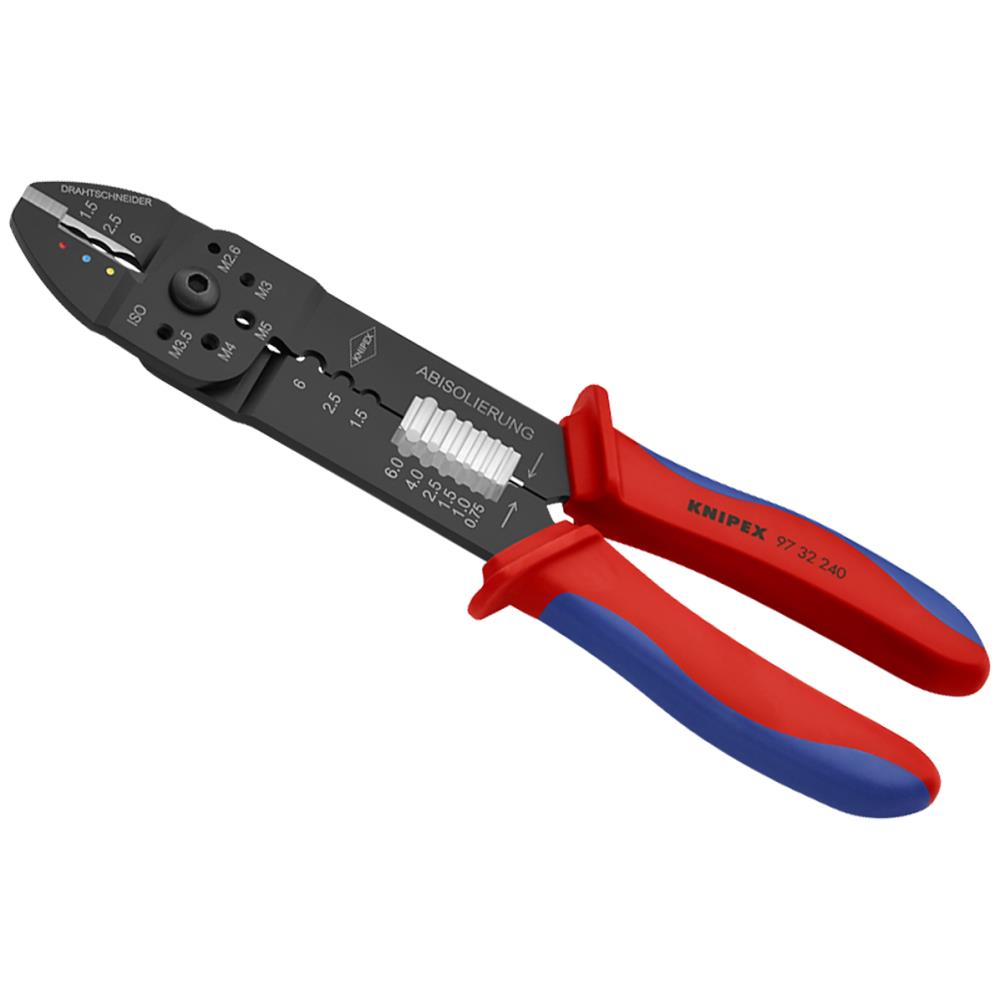 Til at skære kabler, afisolere tråde og crimpe isolerede og uisolerede kabelsko og stikforbindere og åbne stikforbindere. Med gevindhuller til afskæring af Cu- eller Ms-gevindtapper M2,6, M3, M3,5, M4 og M5. Skruet led for høj stabilitet og ensartet løb. Specialstål, særdeles solidt.