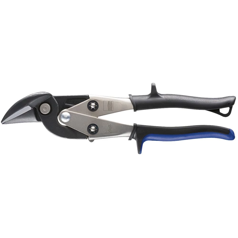 Erdi håndpladesaks til lige gennemklip og figurklip. Saksen er udstyret med udveksling og et særligt fladt skær, som gør at man kan klippe selv meget små radier på sværttilgængelige steder. Skæret har mikrofortanding så emnet ikke glider. Fås til højre- eller venstreklip.