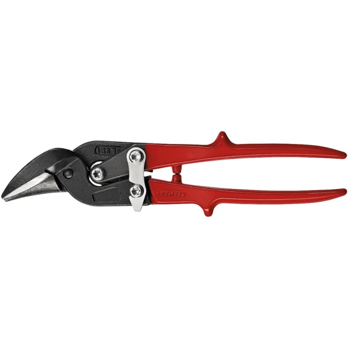 Erdi håndpladesaks til lige gennemklip og figurklip. Særlig kraftig model til særligt store belastninger. Skæret har mikrofortanding så emnet ikke glider. Sænksmedet greb. Fås til højre- eller venstreklip.