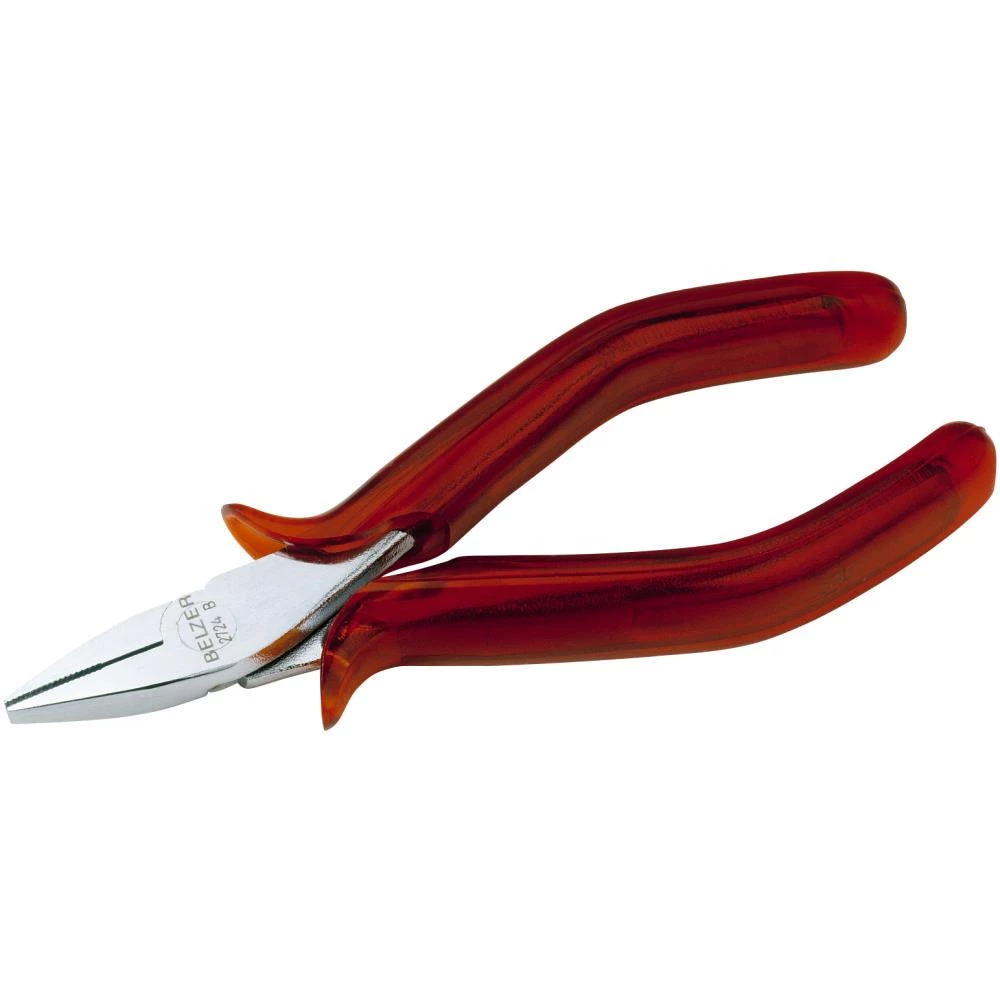 Fladtang med korte tværriflede gribeflader. ISO 5745. Forniklet og forkromet, rustbeskyttet og højglanspoleret. Højtlegeret stål, transparente håndtag af cellulose acetat.