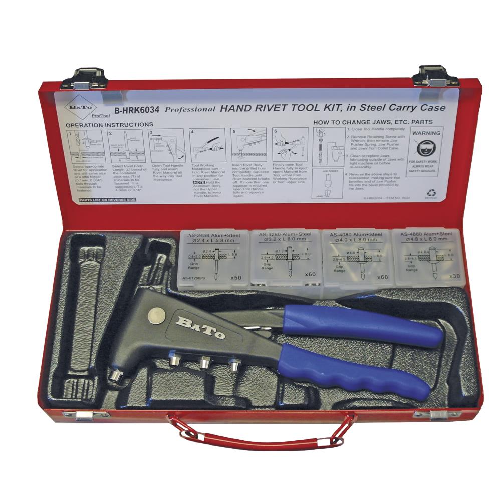 Håndnitte montørsæt med håndnittetang beregnet til alu/stål-nitter 2,4-4,8 mm(5,0 mm) samt rustfri-nitter 2,4 – 4,0 mm. Leveret i metalboks inkl. assorterede nitter str. 2,4×5,8 / 3,2×8,0 / 4,0×8,0 og 4,8×8 mm.