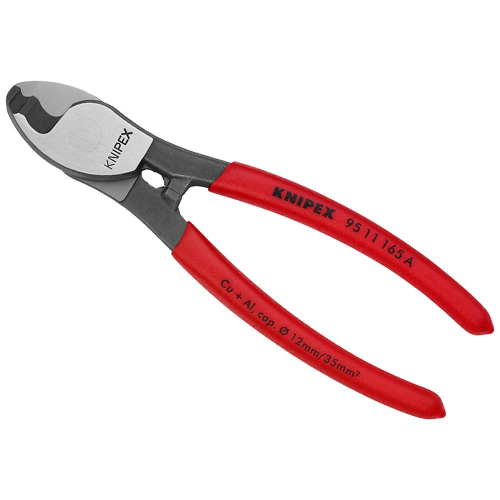 Knipex Kabelsaks 165 mm med afisoleringsfunktion. Klipper op til 12 mm/35 mm2, og afisolerer op til 2,5 mm2. Med vendbar kniv til afisolering på længden af kablet.