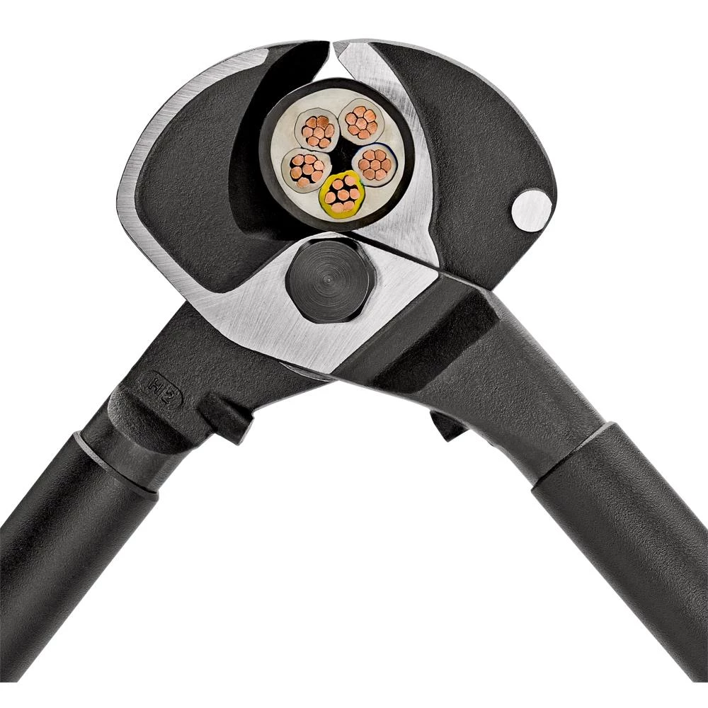 Tohånds kabelsaks til Cu- og Al-kabler, en- og flertrådede. Uegnet til ståltråd og stålwirer. Saksen har hærdede skær med præcisionsslibning, skærer glat og ordentligt uden at klemme. Kun lille opbydelse af kraft på grund af gode udvekslingsforhold og speciel skærgeometri. Klembeskyttelse forhindrer sammenklemningskvæstelser. Justerbart skrueled. Bruneret hoved og flerkomponent greb. Skæreværdi Cu-kabel, flertrådet 150 mm². Skæreværdi Cu-kabel, flertrådet ø27 mm.