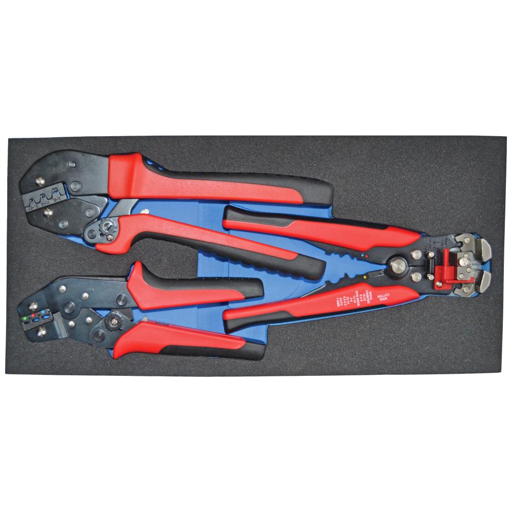 Kabelskotangsæt med 3 stk tænger. EVA 1/3. Sættet indeholder en kabelskotang med skralde for isoleret, kabelskotang med skralde for uisoleret samt selvjusterende afisoleringstang.