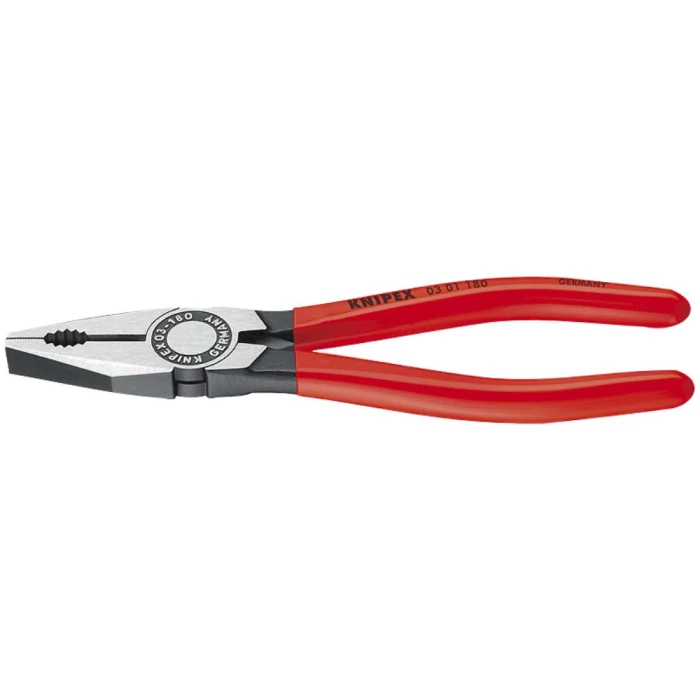 Kombinationstang sort atramenteret betrukket med kunststof 140 mm. Med gribezoner til fladt og rundt materiale til mangfoldige opgaver. Med skær til blød og hård tråd. Lange skær til tykkere kabler. Skær yderligere induktivt hærdede, skærhårdhed ca. 60 HRC. Special-værktøjsstål, smedet, oliehærdet. Fås i flere dimensioner.