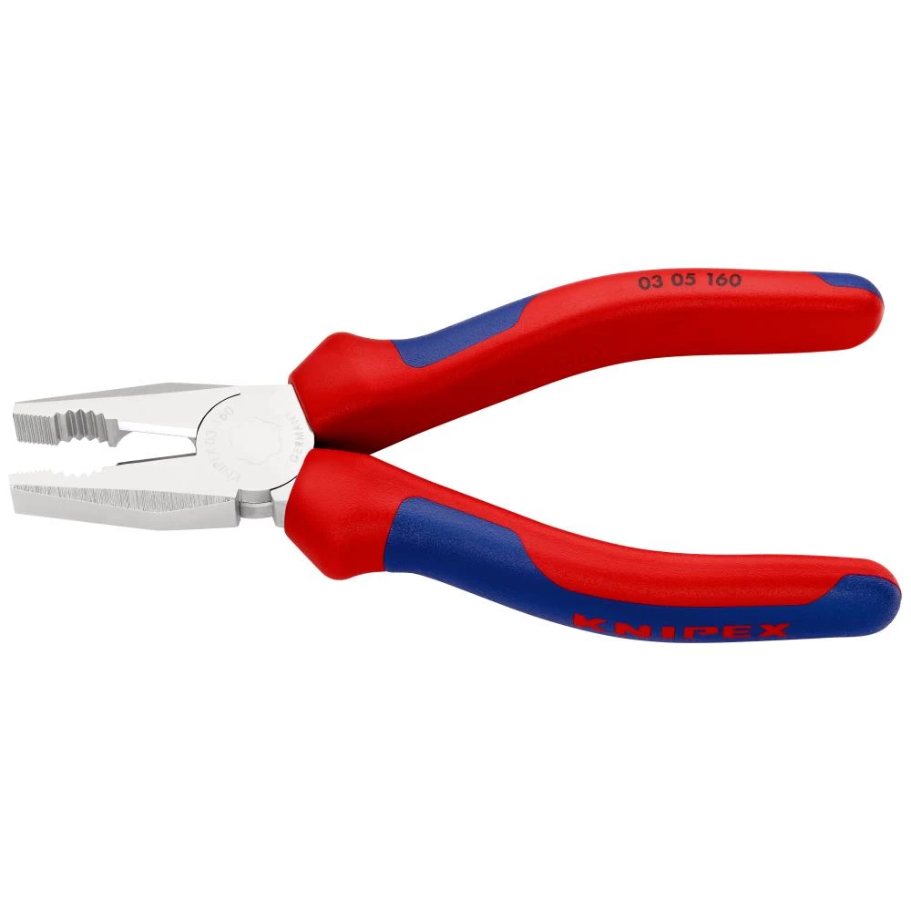 Kombinationstang model 03 05 med flerkomponent-håndtag. Med gribezoner til fladt og rundt materiale til mangfoldige opgaver. Med skær til blød og hård tråd. Lange skær til tykkere kabler. Skær yderligere induktivt hærdede, skærhårdhed ca. 60 HRC. DIN ISO 5746.