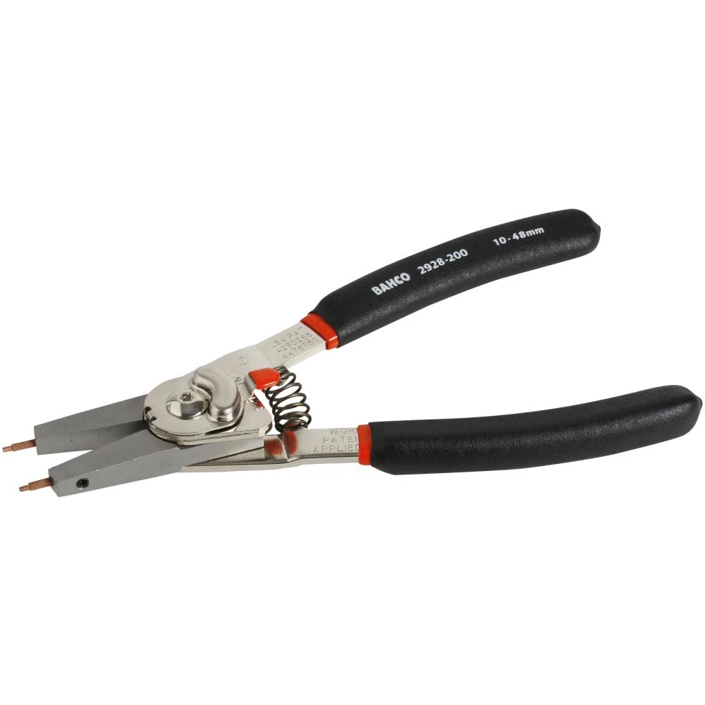 Omstilbar låseringstang for ind- og udvendige ringe. Patenteret tang er forsynet med udskiftelige spidser (lige, 15° og 90°), som enkelt kan tilpasses ind- og udvendige låseringe efter behov. Leveres med 5 par løse spidser. Tangen kan anvendes til indvendige ringe fra 8 til 100 mm diameter og til udvendige ringe fra 3 til 100 mm. De udskiftelige spidser gør, at én tang kan erstatte mange traditionelle tænger. Tangen er forsynet med reguleringsstop-mekanisme, som fastholder tangen i den ønskede position, og hindrer deformering af låseringen. Fås i flere dimensioner.
