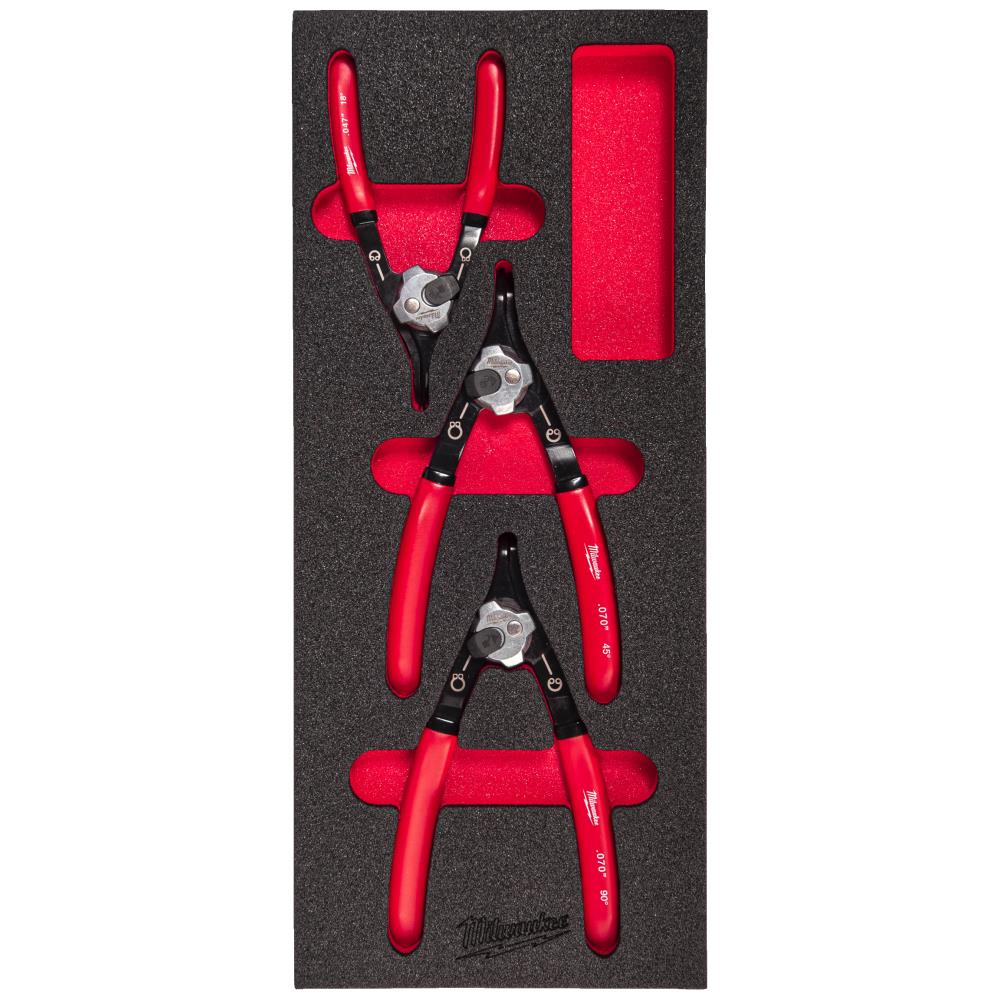 Låseringstangsæt med 3 dele: medium lige låseringstang 1,2 mm, stor lige låseringstang 1,8 mm samt 90° låseringstang 1,8 mm. Alle tænger med skridsikre greb med dobbeltdyppede håndtag. Opbevares i skumindlæg til sortimentet af værktøjsvogne.