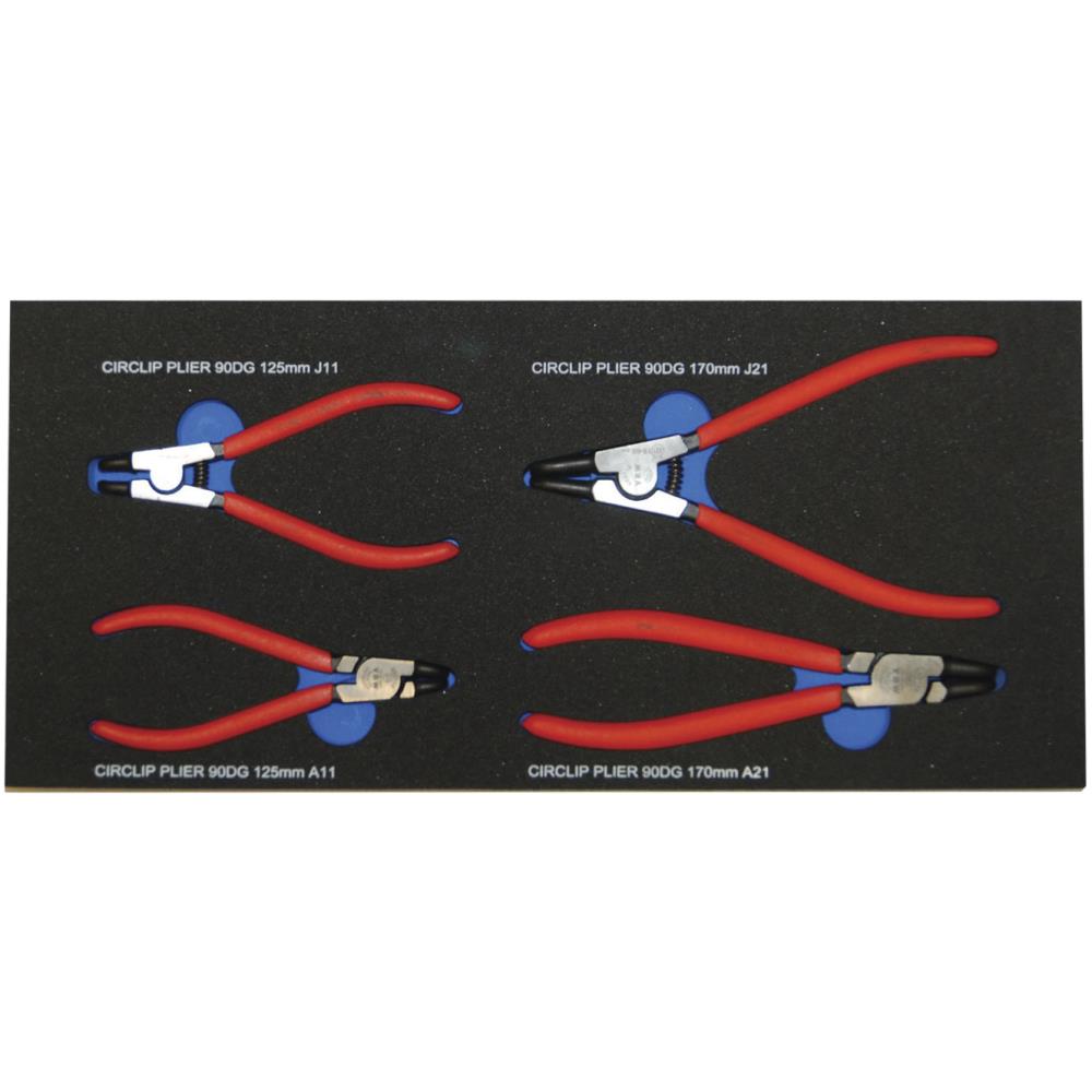 Låseringstangsæt med 4 dele i EVA-skumindlæg klar til værktøjsvognsskuffe. Sættet indeholder 90° buede låseringstænger med dyppet greb: J11 til 12-25 mm indv. låseringe, J21 til 19-60 mm indv. låseringe, A11 til 10-24 mm udv. låseringe og A21 til 19-60 mm udv. låseringe. Skumindlægget fylder 1/3 skuffe i Bato værktøjsvogn.