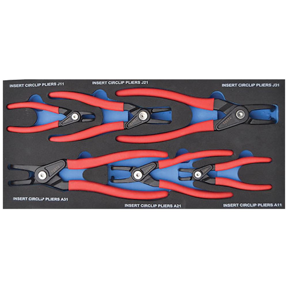 Låseringstangsæt med 6 stk. spidse, 90° buet kraft tænger, udvendig/indvendig. EVA 1/3. Sættet indeholder modellerne J11 / J21 / J31 / A11 / A21 / A31. Alle med dyppet greb.
