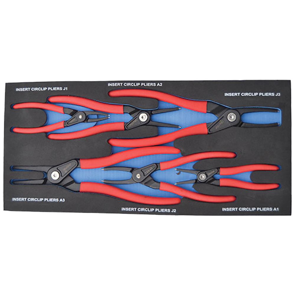 Låseringstangsæt med 6 stk. spidse, lige kraft tænger, udvendig/indvendig. EVA 1/3. Sættet indeholder modellerne J1 / J2 / J3 / A1 / A2 / A3. Alle med dyppet greb.