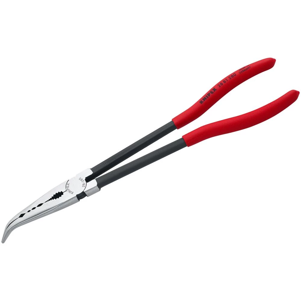Sort atramenteret, hoved poleret, greb betrukket med kunststof. Til gribe-, justerings- og monteringsarbejde på vanskeligt tilgængelige steder takket være den slanke, meget lange form. Dybtliggende arbejdsemner kan nås optimalt med de slanke flad-runde gribespidser. Griber, holder og fører små kobberrør, skruer og kabler samt andre runde dele skånsomt og alligevel sikkert pga. fræsede noter med glat overflade. Fortandet brænderhul til at gribe runde dele. Særligt velegnet til arbejdet inden for automobilbranchen (f.eks. i motorrummet), ved montering og inden for maskinbygning. Slankt og alligevel solidt værktøj. Smedet af special-værktøjsstål, hærdet i olie.