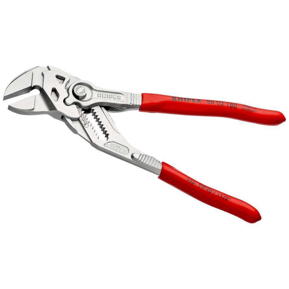 Tangnøgle – tang og skruenøgle i ét værktøj. Erstatter et helt sæt skruenøgler, metrisk og tommer. Glatte kæber for skånsom montering af overfladeforædlede armaturer – arbejde direkte på krom. Egner sig fremragende til at gribe, holde, presse og bøje arbejdsemner. Ingen beskadigelse af kanterne ved sarte armaturer pga. spillerumsfri påsætning over hele fladen. Hurtig indstilling ved tryk på en knap direkte ved arbejdsemnet. Ingen utilsigtet ændring af gribekæbernes indstilling, leddet glider ikke igennem. Trinløs gribning af alle nøglevidder op til den angivne kapacitet vha. parallelt førte kæber. Indbygget skraldefunktion for hurtig spænde og løsne opgaver – uden at fjerne den fra emnet. Høj klemmekraft pga. 10-dobbelt håndkraftforstærkning. Forkromet tang og hoved med kunststofbetrukket greb.