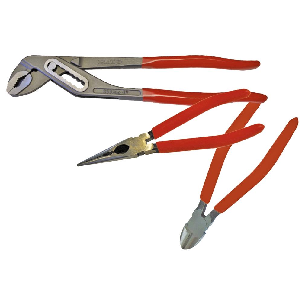 Tangsæt med 3 dele. Indeholder: sideafbider 160 mm, lige spidstang 200 mm og vandpumpetang 250 mm – alle med dyppet greb.