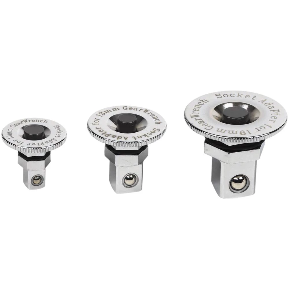 Adaptersæt med 3 dele til flexgear. Sættet indeholder 1/4″ for 10 mm nøgle, 3/8″ for 13 mm nøgle og 1/2″ til 19 mm nøgle.
