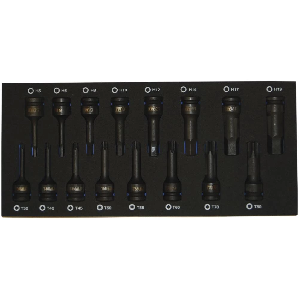 Stifttopsæt med 16 dele i EVA-skumindlæg klar til værktøjsskuffe. Sættet indeholder 1/2″ 6kt kraft-stifttoppe 5-6-8-10-12-14-17 og 19 mm samt 1/2″ Torx stifttoppe TX30-40-45-50-55-60-70 og 80. Skumindlægget fylder 1/3 skuffe i Bato værktøjsvogn.
