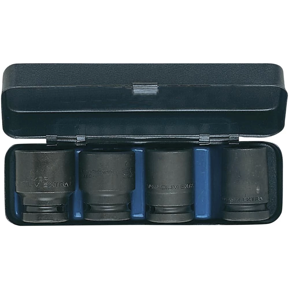 Krafttoppe i sæt. Indfæstning: 1/2″ 3121-G 12,5 ISO 1174. Sort finish. Højtlegeret stål, special hærdet. For maskinelt brug. Med gennemboring for låsering. Leveres i ovnlakeret stålkasse.