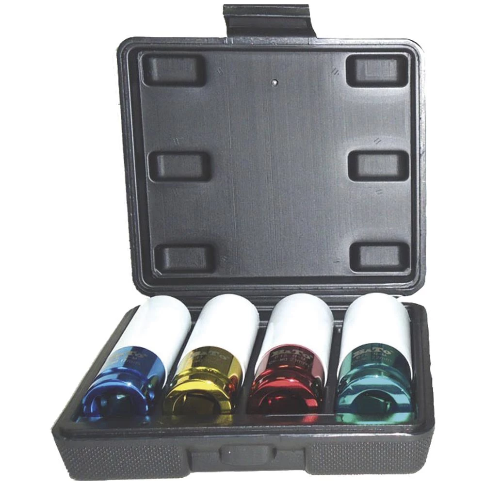 Auto-krafttopsæt med 4 dele. 1/2″ 4kt krafttoppe med 6kt og plastbeskytter til alufælge. Sættet indeholder: 17-19-21-22 mm og leveres i praktisk plastboks.