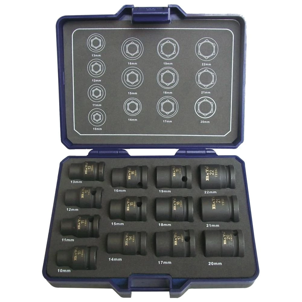 Krafttopsæt med 13 dele. Korte 1/2″ kraftoppe med magnet. Sættet indeholder: 10-11-12-13-14-15-16-17-18-19-20-21-22 mm. Leveres i plastboks.