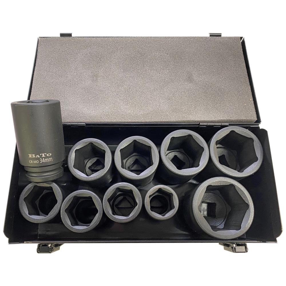 3/4″ krafttopsæt med 10 lange toppe. Indeholder 6kt: 27, 30, 32, 33, 34, 36, 38, 41, 46, 50 mm. Leveres i kuffert.