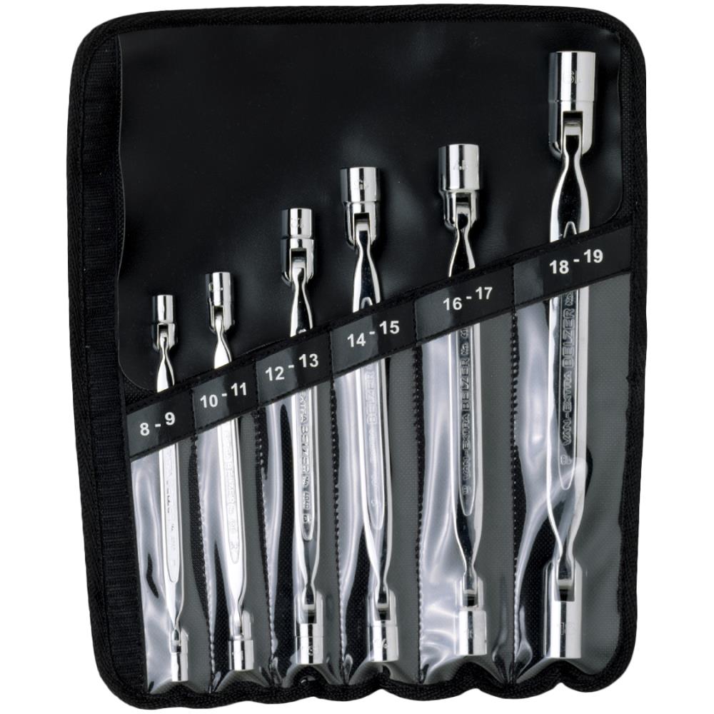 Ledtopnøglesæt med 180° svingbare toppe (90° til hver side) og indv. 12kt. Leveres i plastmappe med velcrolukning.