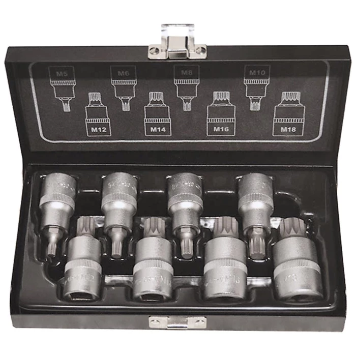 Stifttopsæt med 8 dele. 1/2″ 12kt stifttoppe. Indhold: XZN 5 – 6 – 8 – 10 – 12 – 14 – 16 og 18. Leveres i metalboks.