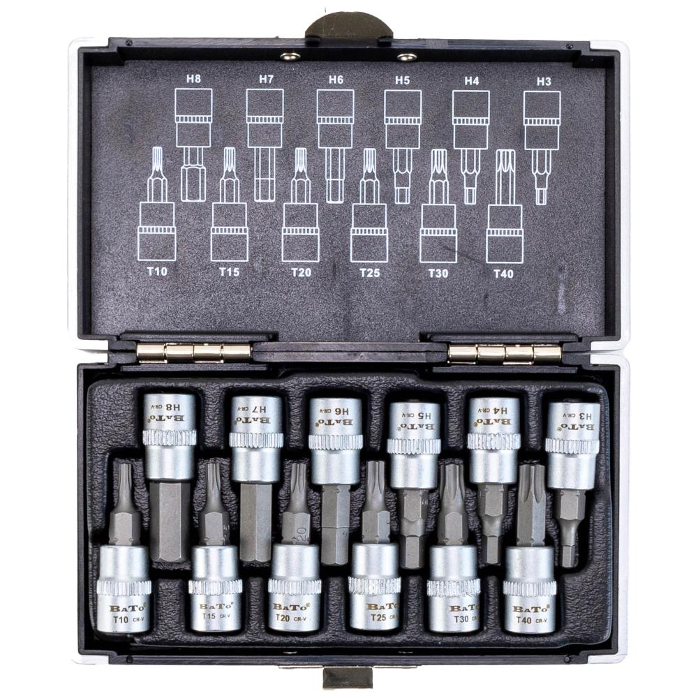 Stifttoppesæt med 12 stifttoppe 1/4″ 6kt. Sættet indeholder 6kt str. 3-4-5-6-7-8 mm samt Torx str. T10-15-20-25-30-40. Leveres i praktisk kuffert.