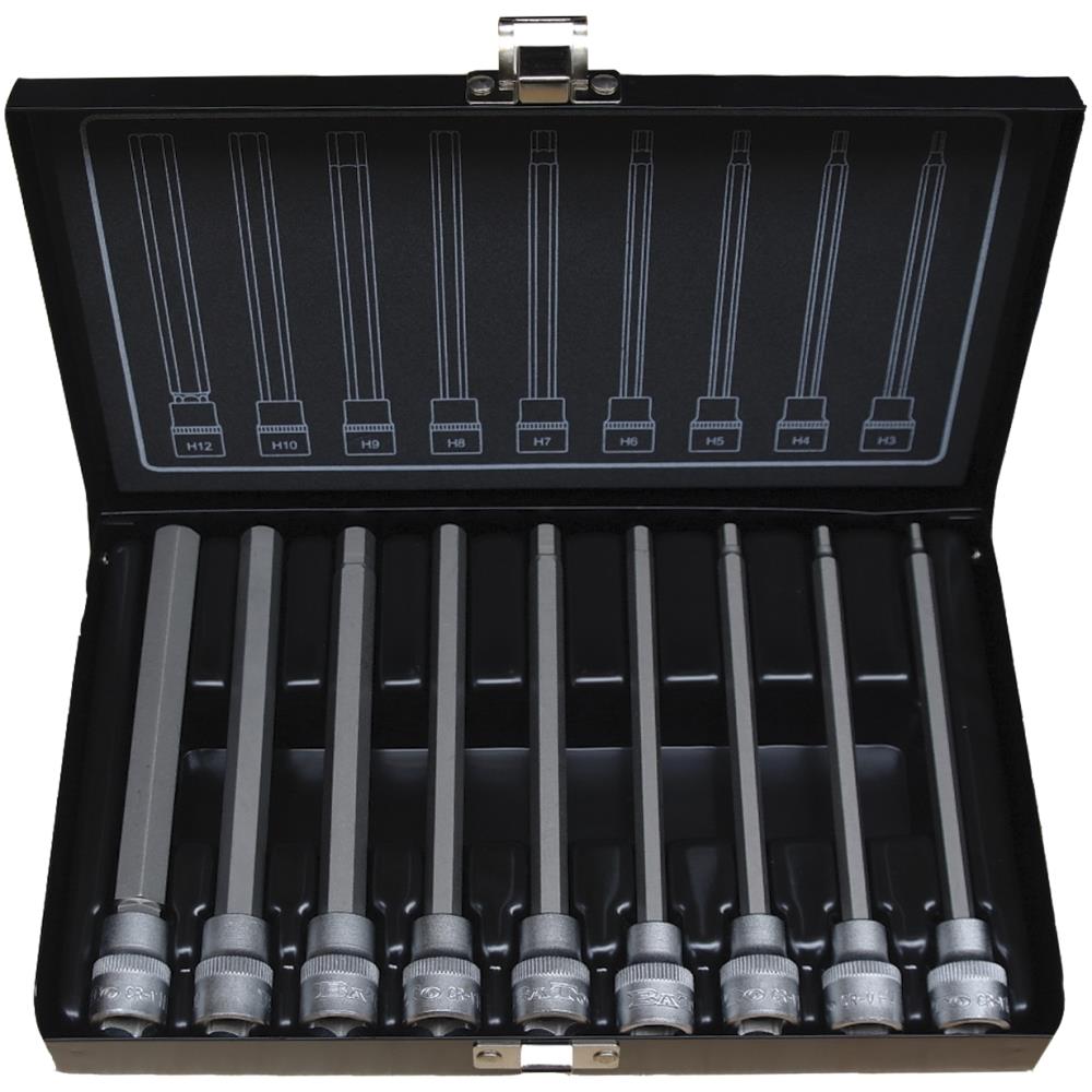 Stifttopsæt med 9 dele. Lange 3/8″ 6kt stifttoppe: 3-4-5-6-7-8-9-10-12 mm. Leveres i metalboks.