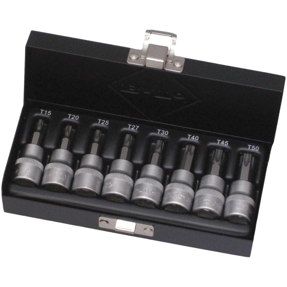 Stifttopsæt med 8 dele. 3/8″ Torx stifttoppe: TX15-20-25-27-30-40-45-50. Leveres i metalboks.