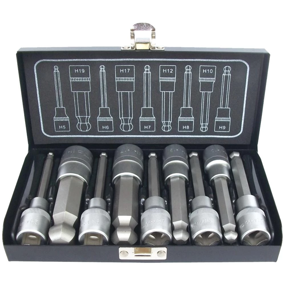 Stifttopsæt med 9 dele. 1/2″ 6kt stifttoppe med kugle – 100 mm lange. Indhold: 5,0 – 6,0 – 7,0 – 8,0 – 9,0 – 10,0 – 12,0 – 17,0 – 19,0 mm. Leveres i metalboks.